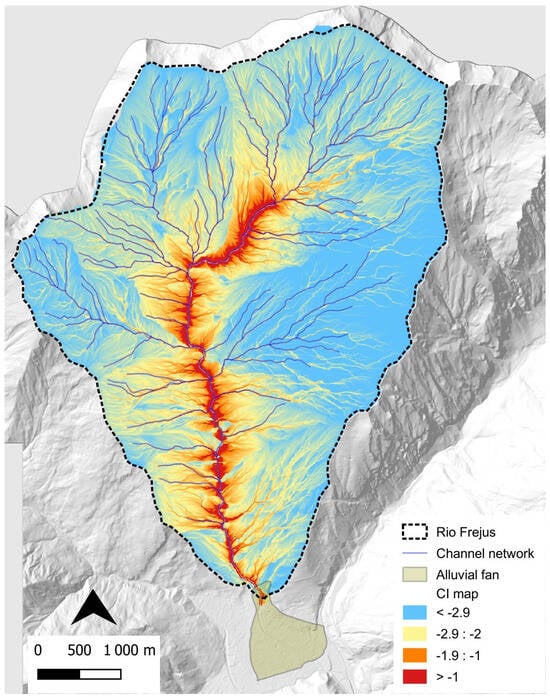 The sediment connectivity index (CI) is a topography-based index, originally developed by Borselli et al. [] and adapted to mountain environments by Cavalli et al. []. Using a high-resolution DEM, a CI map of the catchment can be generated by calculating the logarithm of the ratio between the upslope (Dup) and downslope (Ddn) components for each cell, as described in Equation (3):