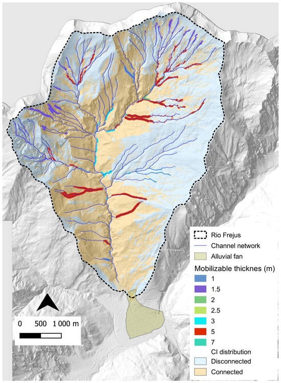 The CI method was applied to the Rio Frejus catchment to identify the sediment source areas that are effective in supplying debris flow events, which can reach the alluvial fan area, as previously proposed [].