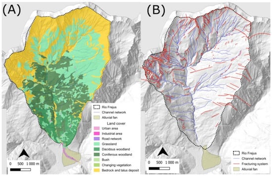 The Rio Frejus catchment (Table 1) is located in the municipality of Bardonecchia (Susa Valley, Western Italian Alps) in the province of Turin. The catchment, elongated north–south, has an area of about 22 km2 and is subdivided into five sub-catchments, which correspond to the tributary channels of the main incised channel of the Rio Frejus (Figure 1A).