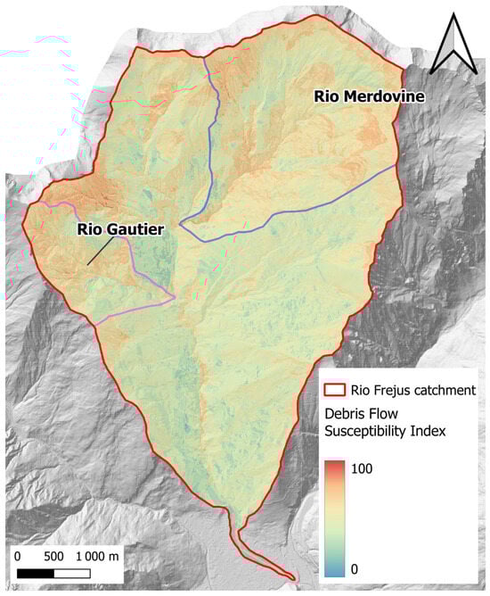 The resulting map confirms that the sub-catchments most susceptible to debris flow initiation are Rio Merdovine (northeast) and Rio Gautier (west), which should be the focus of any monitoring.