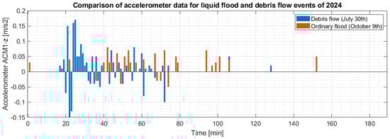 Comparison of accelerometer data on the z-axis for the flood event of 9 October and the debris flow event of 30 July.