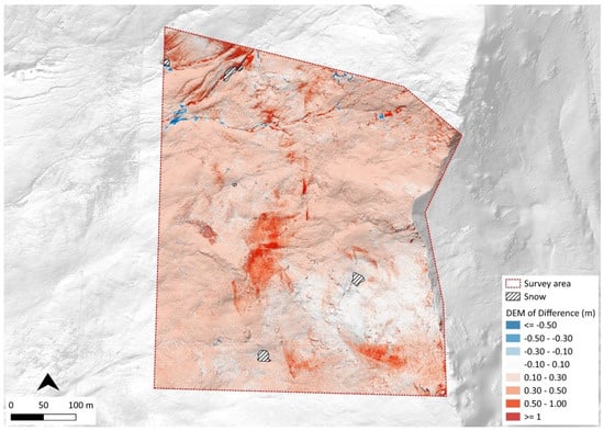 where DEM(t1) represents the post-event terrain model, and DEM(t0) represents the pre-event model. This results in a DoD where erosion areas will be characterized by negative values (blue color), while deposition areas will show positive values (red color in Figure 13).