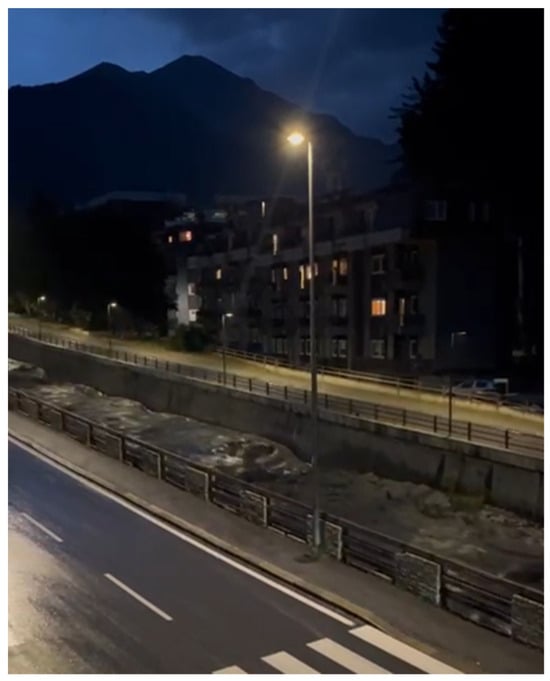 On 31 July 2024, a new storm cell affected the Rio Frejus catchment, triggering a flow event that passed along the Rio Frejus channel between midnight and 01:00 A.M. on 1 August 2024. This event had a lower flow rate than that of 30 July, but it was sufficient to visually notice the deposits left by the previous one.
