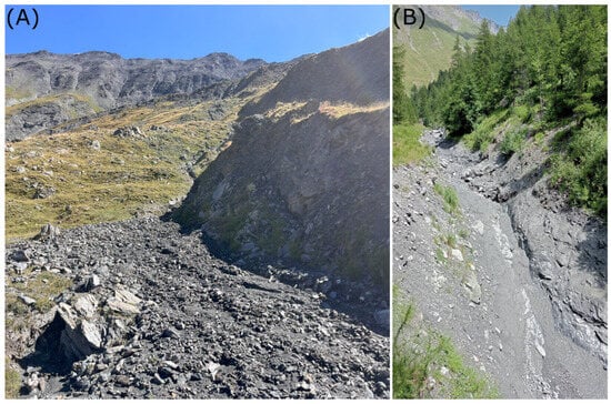 (A) Debris flow initiation area at the head of the Rio Merdovine sub-catchment. (B) Traces of the passage of debris flow just upstream of the confluence between the Rio Merdovine and the Rio Frejus main channel.