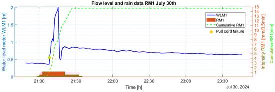 Despite the demonstrated efficiency of the system, some limitations emerged. The low sampling rate (30 s) of water level sensors may have affected the resolution of hydrograph waveforms, limiting the precision of flow velocity calculations. Additionally, the monitoring network was only partially operational during the July 2024 events, reducing the completeness of data collection. Future improvements should focus on increasing sensor redundancy and enhancing data transmission to ensure more reliable real-time monitoring. However, it is important to note that such improvements should be made solely in the technological domain, as the sensor types and their distribution proved to be satisfactory.