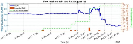 Comparison between the values recorded by the RM2 rain gauge and the level values measured in the Rio Frejus channel through WLM1 between 31 July and 1 August.