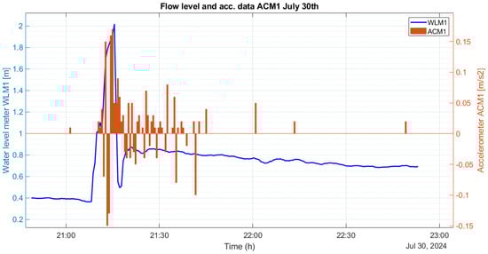 RM1 recorded 15 mm of precipitation in less than 30 min (30 mm/h) prior to the debris flow event observation, while RM2 measured a slightly lower value of 10 mm during the same time window, corresponding to an hourly intensity of 20 mm/h. Both intensity values recorded by rain gauges were comparable with the weather radar estimation and reached the minimum triggering threshold value assigned to debris flow initiation for ECM catchments (20 mm/h), under which the Rio Frejus catchment falls. By processing the flow height values at WLM1, the characteristics of the flow and its front were extracted, showing a 1.5 m increase during the passage of the debris at 09:10 P.M. on 30 July 2024. The accelerometers recorded very high acceleration values during the same event, confirming the high energy content of the flow (Figure 19 and Figure 20).