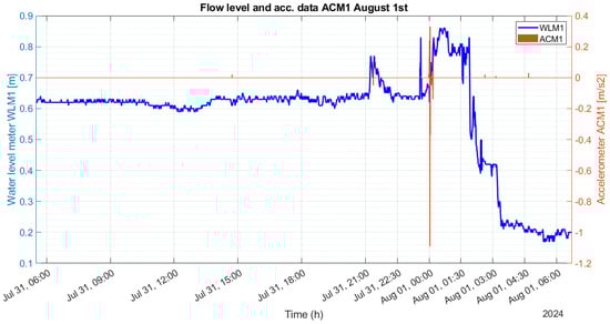Comparison between the values recorded by the ACM1 accelerometer along the z-axis and the level values measured in the Rio Frejus channel through WLM1 between 31 July and 1 August.