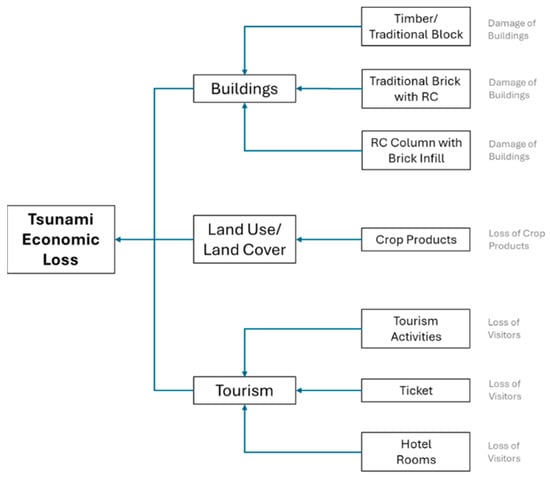 The total tsunami economic loss () can be calculated as the sum of the economic losses in building, land use, and tourism sectors (Equation (4))