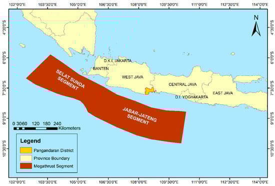 The tsunami generator source used in this model is the worst scenario which has affected the Pangandaran District []. The Jabar-Jateng megathrust segment generates this worst scenario. This megathrust segment is located in the southern part of Java Island, directly opposite the Pangandaran District (Figure 3). This megathrust segment is the segment that has the longest size among the other segments in the southern region of Java Island, with the highest potential magnitude. There are other segments with the same potential magnitude but provide different tsunami potential results due to differences in other parameters and location. Based on the model conducted by (2020) [], the Jabar-Jateng megathrust segment generates a tsunami with the worst results for the Cijulang sub-district, Pangandaran District, where the research area of this paper is located. This megathrust segment generates a tsunami with a maximum inundation height of 15.9 m, an arrival time of 28 min, and a maximum inundation range of 2.215 km. In comparison, the other segments have inundation height results of no more than 10 m, arrival times of no faster than 30 min, and an inundation range of no more than 1.1 km.