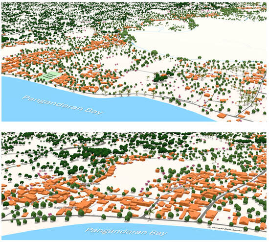 Estimating tsunami economic loss as described in Equations (1)–(4) requires some data and assumptions. The economic loss in buildings ( in Equation (1)) requires the number of inundated buildings, as well as their area (), type, damage ratio (), and value (). The number, type, and area of the buildings can be derived from the LoD-2 model (Figure 5) as presented in Table 4, while the damage ratio is estimated based on [] and the inundation height of the buildings. The value of the building per m2 () is analyzed from the interviews, and determined as IDR 3 million/m2 for a one-storey building and IDR 6 million/m2 for a two-storey building. Table 4 presents the estimated economic loss from buildings.