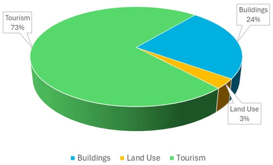 In total, the potential economic loss due to the tsunami disaster is IDR 208.79 billion; the detailed summary is presented in Table 10. The table shows that IDR 152.43 billion, or about 73% of the total potential economic loss, comes from tourism factors (Figure 10). Therefore, it is clear that tsunami disasters will severely affect tourism areas.