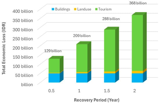It was stated before that all calculations of estimated economic losses in Equations (1)–(4) are assumed for a one-year recovery period. A calculation using a shorter recovery period would reduce the estimated economic losses, particularly in land use and tourism factors. Different recovery periods are simulated, and the results are presented in Figure 11. It compares estimated economic losses using various recovery periods (0.5, 1, 1.5, and 2 years) from all three sectors. From the simulation, a half-year difference in the recovery period will give a difference of IDR 80 billion in the total economic loss. By reducing the recovery period to 6 months, savings of IDR 80 billion can be used to compensate and rebuild the damage in buildings and productive lands as well as to reactivate the tourism and public facilities and infrastructure.