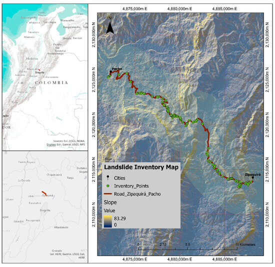 This study focuses on the Zipaquirá–Pacho road corridor, which connects the municipality of Zipaquirá (5.024107°, −74.014034°)—located 29 km from Bogotá, Colombia’s capital and part of its metropolitan area—with the municipality of Pacho (5.133582°, −74.154024°), situated in the department of Cundinamarca, 88 km from Bogotá and 35.93 km from Zipaquirá. The region where the road corridor is located is an area where emergencies have been reported due to several factors that reduce slope stability and increase the risk of landslides, especially in areas with steep slopes.