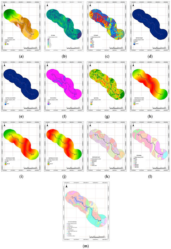 Layers of causal factors for assessment of susceptibility, Zipaquirá–Pacho: (a) elevation; (b) slope; (c) aspect; (d) flow length; (e) flow accumulation; (f) insolation; (g) sen2p; (h) distance to faults; (i) distance to folds; (j) distance to rivers; (k) ground cover; (l) geology; (m) geomorphology.