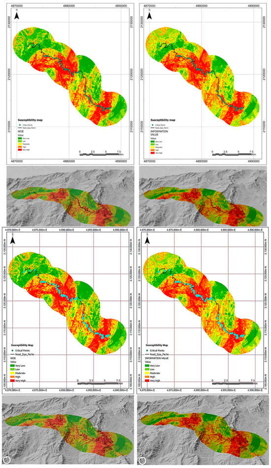 Nevertheless, because IV relies on the frequency of landslide occurrence within each class, it may overestimate susceptibility in areas with few historical events. In contrast, WoE incorporates conditional probabilities, offering a more balanced distribution of susceptibility levels.