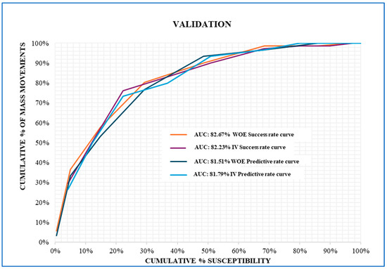 Validation of the landslide susceptible zones produced by the IV and WoE models was performed using the receiver operating characteristic (ROC) curve method—specifically, by calculating the area under the curve (AUC). This statistical tool is widely used to estimate the accuracy of presence/absence predictive models [56]. An AUC value between 0.9 and 1 indicates excellent performance; between 0.8 and 0.9, very good performance; between 0.7 and 0.8, good performance; between 0.6 and 0.7, average performance; and between 0.5 and 0.6—or equal to or less than 0.5—poor performance [50,57]. In this study, based on ROC curve analysis, the AUC values for both models exceeded 81%, indicating very good performance for landslide prediction (see Figure 6).