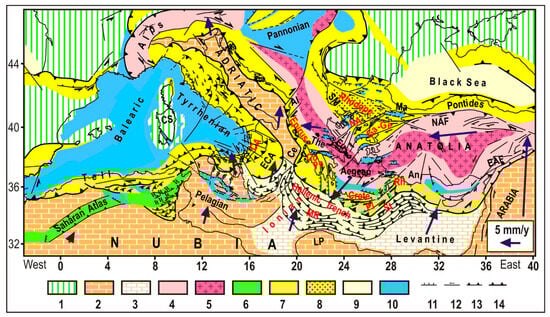 Tectonic scheme of the Mediterranean area. (1) European continental domain, (2) Nubia-Adriatic and Arabia continental domain, (3) Ionian-Levantine oceanic domain, (4, 5) outer and inner belts of the Tethyan system, constituted by metamorphic massifs and ophiolitic units, respectively, (6) Atlas belt, (7) other orogenic belts, (8) Rhodope and Serbo-Macedonian (SM) massifs, (9) Black Sea thinned domain, (10) Cenozoic basins, (11, 12, 13) extensional, transcurrent, and compressional features, and (14) outer fronts of the orogenic belts. Al = Albanides; An = Antalya peninsula; Ce = Cephalonia fault; Co = Corinth trough; CA = Calabria; CS = Corsica–Sardinia block; EAF = Eastern Anatolian Fault; ECA = External Calabrian Arc; Eu = Eubea; Ga-Ge = Ganos–Gelibolu thrust fault; Ma = Marmara trough; MR = Mediterranean ridge; NAF = North Anatolian Fault; NA = North Aegean trough; Pe = Peloponnesus wedge; Pl = Pliny fault; Rh = Rhodes; St = Strabo fault; The = Thessaly.