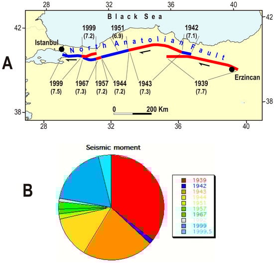 (A) Main segments of the North Anatolian Fault that failed since 1939 (based on [,]). Seismicity data as []. (B) The pie chart shows the relative seismic moment of the major earthquakes of the above sequence. The total seismic moment released from 1939 to 1999 is 1.16 ∙ 1021 Nm [].