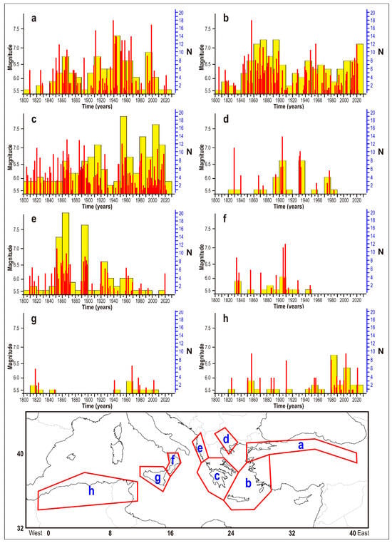 Time patterns of seismic activity since 1800. (a) North Anatolian Fault, (b) westernmost Anatolia and Crete–Rhodes arc, (c) southern Greece, (d) Serbo-Macedonian fault system, (e) Epirus thrust front and Albania shear faults, (f) Calabrian wedge, (g) Sicily, and (h) Tell belt. The yellow columns indicate the number of earthquakes with M ≥ 5.5, while the red bars relate to the equivalent magnitude (sum of energies converted in magnitude by the relation log E = 1.5M + 11.8) of the annual seismicity. The geometries of the zones considered are shown in the map, with the corresponding letters. Data from [,,,,,,,,,,,].