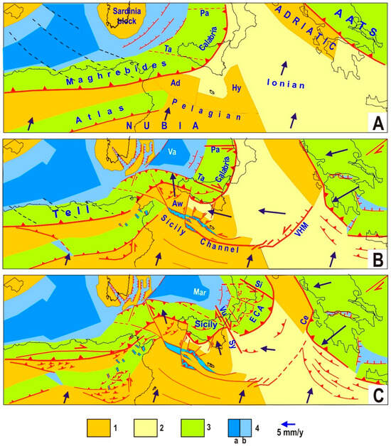 Tentative reconstruction of the tectonic processes that developed in the central and western Mediterranean regions in response to the late Miocene collision between the Anatolian–Aegean Tethyan system (AATS) and the Adriatic promontory []. See text for explanations. (1) Continental domains, (2) thinned continental and oceanic domains, (3) orogenic belts, and (4) zones of intense (a) or moderate (b) crustal thinning. (A) Late Miocene. Ad = Adventure domain; Hy = Hyblean plateau, Pa = Palinuro fault, and Ta = Taormina fault. (B) Middle Pliocene. Aw = Adventure wedge, Va = Vavilov basin, and VHM = Victor Hensen–Medina fault. (C) Middle Pleistocene. Ce = Cephalonia fault, ECA = External Calabrian Arc, Mar = Marsili basin, Si = Sibari fault, and Sy-Vu = Syracuse–Vulcano fault. Other symbols as in Figure 1.