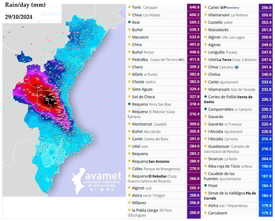 Figure 2). During the DANA event in Valencia, the Poio ravine carried water volumes surpassing 2200 cubic meters per second—five times the average flow of the Ebro River at its mouth. On 29 October, an official maximum precipitation record was set within 24 h, reaching 771 L per square meter in Turís (
