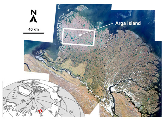 Thus, Arga Island presents an ideal location for the development of a method for GIS mapping of thermokarst landscapes and the identification of previously undiscovered patterns in the evolution of thermokarst landforms. The island is located at the interface between the continent and the sea, and its terrain is particularly vulnerable to the effects of climate shifts. Modern tectonic and permafrost degradation processes simultaneously influence the landscapes of Arga Island. Consequently, novel correlations between the island’s geology, contemporary tectonic processes, and permafrost degradation-related physical phenomena could be established. LC mapping of Arga Island is facilitated by the uniformity of thermokarst landforms and generally flat topography. Additionally, the restricted quantity of LC classes in the study area simplifies the mapping process. Moreover, Arga Island is not accessible for fieldwork, making the analysis of RS data the only approach of monitoring landscape and environmental changes in a substantial portion of the largest Arctic delta. To minimize coastal marine effects, we studied a rectangular region covering the island’s interior, excluding near-shore areas.