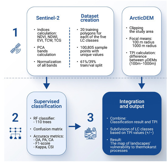 The study itself consisted of the following stages: First, we prepared the data by selecting cloud-free satellite imagery, creating indices, normalizing all used bands, and finally creating the composite image. The second stage involved recognizing the land cover (LC) classes that are relevant to various stages of the thermokarst process. Furthermore, training polygons were manually delineated for each land cover class. In stage three, we conducted random forest classification of the composite and evaluated its accuracy. The fourth stage involved calculating the topographic position index (TPI) and analyzing the spatial distribution of LC classes within positive and negative TPI values. Finally, we created a map that not only illustrates the present condition of thermokarst terrains on Arga Island but also enables the prediction of the possible future development of these landscapes in the study area.
