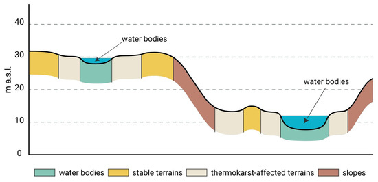 - The stable terrains within the depressions and valleys (negative TPI values) are indicative of the final stage in the thermokarst landscape evolution. A minor part of the analyzed area comprises these stable surfaces, accounting for only 6%. The sandy permafrost deposits in this area have been completely degraded, and the elevation of the land surface is close to sea level. However, these areas have been stable for a sufficiently long period of time. They have become drier, and a later botanical succession is typical of them. We can assume that these areas have already undergone significant topographic changes and will remain stable in the future.