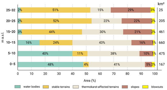 The spatial distribution LC classes within the hypsometric categories of relief also indicate a correlation between them (Figure 5). The stable terrains correspond to the highest elevations, and their area decreases as the elevation diminishes. Conversely, the area of thermokarst-affected terrains increases as elevation decreases. Therefore, the observation of the classification results and statistics of the mapped LC classes in relation to topography informed the further morphometric study.