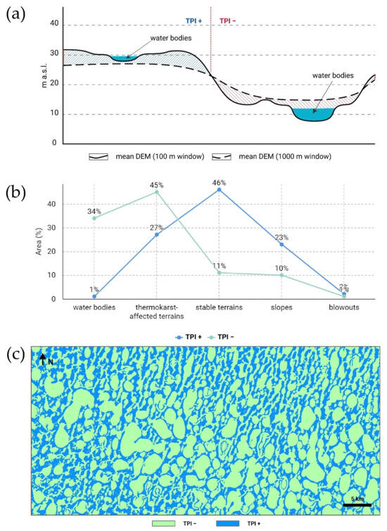 The TPI was used to identify uplands and thermokarst landforms such as depressions and valleys. The TPI image was generated by calculating the difference between the mean DEMs that were generated using moving window radii of 100 and 1000 m (Figure 6a). The analysis of the spatial distribution of LC classes within positive and negative TPI value ranges revealed significant differences between these areas (Figure 6b). Stable terrains are typically associated with positive TPI values, while thermokarst-affected areas and water bodies tend to be concentrated in depressions and valley areas, which are identified by negative TPI values. The resulting TPI map demonstrates the localization of areas with positive and negative TPI values (Figure 6c).