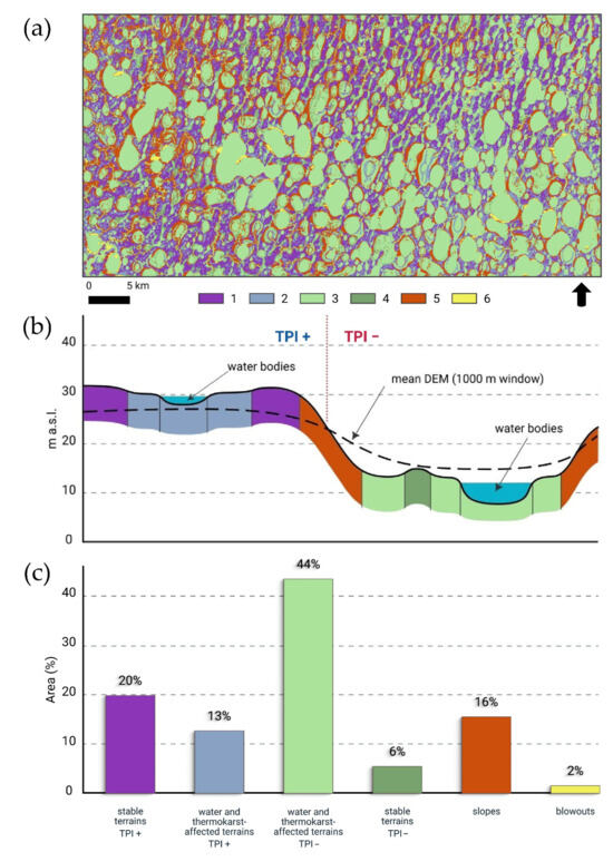 The results of combining supervised classification with morphometric analysis: a map that illustrates the categories according to their level of vulnerability to thermokarst processes (a); the topographic profile with mapped categories (b); and the spatial distribution of mapped categories (c). Legend: 1—the stable terrains in the undegraded uplands; 2—the thermokarst-affected terrains and water bodies in the undegraded uplands; 3—the thermokarst-affected terrains and water bodies in the depressions and valleys; 4—stable terrains within the depressions and valleys; 5—slopes; 6—blowouts.