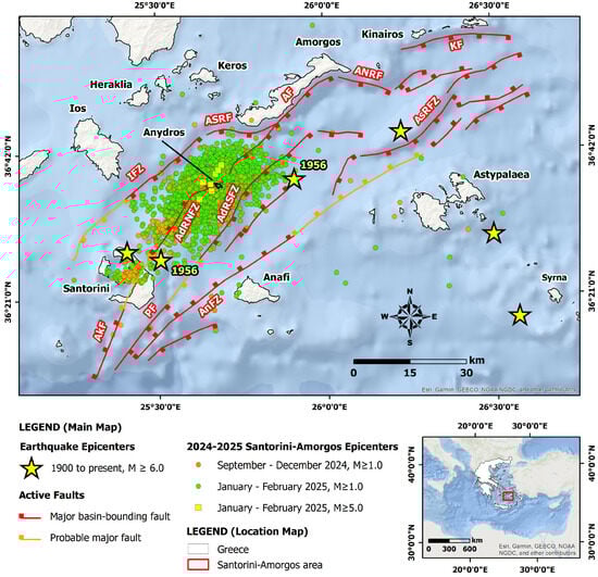 Santorini–Amorgos area that was mainly affected by the early 2025 earthquake sequence, along with the major basin-bounding faults and the probable major faults (ticks on the hanging wall) based on the tectonic and kinematic map of the Santorini–Amorgos Shear Zone published by Tsampouraki-Kraounaki et al. [34]. The epicenters of the M ≥ 6.0 earthquakes since 1900 are from the earthquake catalogue of Makropoulos et al. [35], and the epicenters in the affected area from September 2024 to February 2025 were recorded at the Seismological Laboratory of the National and Kapodistrian University of Athens (SL-NKUA) [36]. AdRNFZ: Anydros Ridge North Fault Zone; AdRSFZ: Anydros Ridge South Fault Zone; AF: Amorgos Fault; AkF: Akrotiri Fault; AnFZ: Anafi Fault Zone; ANRF: Amorgos North Relay Fault; ASRF: Amorgos South Relay Fault; AsRFZ: Astypalaea Ridge Fault Zone; IFZ: los Fault Zone; KF: Kinairos Fault; PF: Perissa Fault. Sources of the basemap: Esri, Garmin, GEBCO, NOAA NGD, and other contributors.