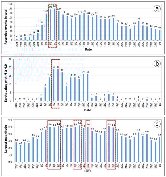 For earthquakes with magnitudes of M ≥ 4.0, the main seismic activity occurred between 1 and 12 February, with a peak on 3 and 4 February (19 events) [36]. After 12 February, there was a significant decrease, with very few earthquakes after 18 February. From 27 February onwards, no earthquakes with magnitudes of M ≥ 4.0 occurred (Figure 2b). Regarding the largest recorded seismic magnitude, the first wave of intense seismic activity started on 1 February and peaked between 3 and 10 February, with magnitudes ranging from M = 5.0 to M = 5.2 [36]. After 10 February, there was a gradual decrease in the magnitude of the larger earthquakes, with the exception of 17 February, when an M = 5.1 earthquake is recorded, while from 20 February onward, seismic activity weakened significantly [36] (Figure 2c).