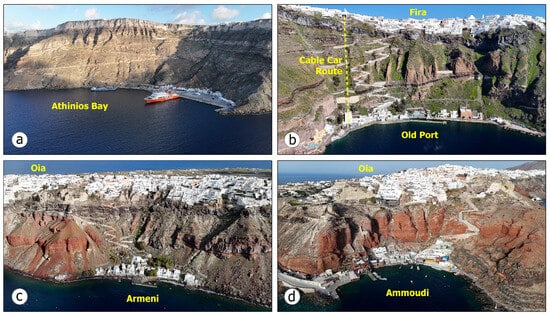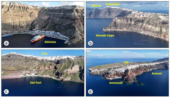 Panoramic drone views of areas in Santorini Island, where rockfalls were triggered by the early 2025 Santorini–Amorgos earthquake swarm. (a) Athinios Bay and the steep slope south of the port, (b) the central part of the caldera, with Alonaki Cape and Skaros Rock located west of Imerovigli Village, (c) the old port of the island downslope of Fira Town, and (d) the northern part of Santorini, with Armeni and Ammoudi coastal settlements downslope of Oia Village.