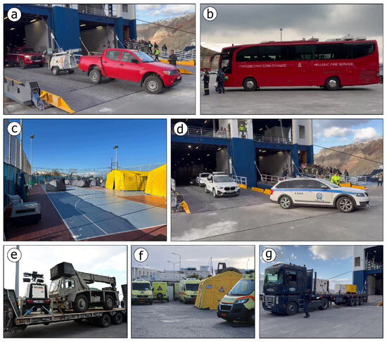 One of the key actions taken by the operational structures of the Civil Protection system in response to the imminent geophysical disaster in the volcanic complex of Santorini was the deployment of additional personnel and equipment to the earthquake-affected islands. For the Hellenic Fire Service, this included the dispatch of personnel and equipment (a) [48], such as the Mobile Operational Center “Olympos” (b) and SAR teams (EMAK), which were stationed in tents within an open space (c) in Santorini, as required by strict disaster safety protocols. Patrol vehicles and personnel of the Hellenic Police (d) [49] arrived early in Santorini. Similarly, the Armed Forces deployed special vehicles and equipment (e), while health services, including the Special Department of Disaster Medicine of the National Center for Emergency Assistance (f), were also sent. Additionally, utility services, including power generators from the Hellenic Electricity Distribution Network Operator [50], were dispatched to ensure continued operations in the event of a large power outage (g).