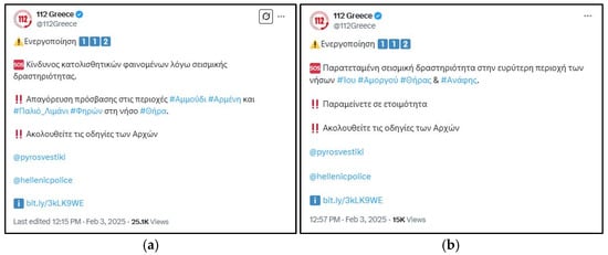 In the context of the January–February seismic activity, the 112 service was activated for the first time for landslides in Greece. In particular, on 3 February 2025 (12:14 p.m. local time) a message was sent to the residents of Santorini, informing them of the existing hazard and risk of landslides due to seismic activity and the prohibition of access to the coastal areas of Ammoudi and Armeni, as well as the old port of Fira on the island of Santorini, while urging residents to follow the instructions of the authorities (Figure 6a). Shortly after the first message (12:57 p.m. local time), a follow-up message was sent to the residents of Ios, Amorgos, Santorini, and Anafi, informing them of the ongoing seismic activity in the broader area and urging them to stay alert and follow the instructions of the authorities and the operational structures of the Civil Protection system (Figure 6b).