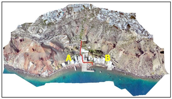 A similar phenomenon was observed during the early 2025 Santorini–Amorgos seismic sequence. The secondary effects include landslides not only on the slopes of the Santorini caldera, but also in areas outside of it [44] (Figure 3). Specifically, these areas include (i) the southern coastal part of Santorini, outside of the caldera; (ii) the central-eastern part of the steep slopes of the caldera; and (iii) the northern part of the island. The first area includes rockfalls triggered upslope of the Red Beach and slides upslope of Vlichada Beach. The second area is located upslope of the port of Athinios, at Alonaki Cape located at a distance of 1.5 km north of the port of Athinios, upslope of the old port of Fira, downslope of Imerovigli, and on the slope of the area of Skaros in Imerovigli. The third one is located along the Fira–Oia provincial road [44] (Figure 3 and Figure 4). The triggered effects were mapped and verified through field visits conducted by the authors on the island during the evolution of the early 2025 seismic sequence, as well as through testimonies from residents of Santorini, who witnessed these events.