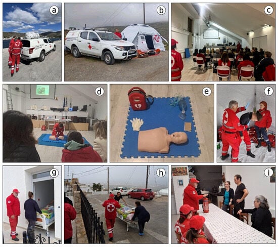 The staff of the NCEA in Santorini, Amorgos, and Ios were reinforced with a team from the Special Department of Disaster Medicine (ETIK in Greek), comprising a doctor, rescuers with the necessary medical equipment, and additional rescue personnel and ambulances (Figure 5f). Simultaneously, the Health Operations Center (KEPY in Greek) and the Unified Coordination Operations Center (ESKE in Greek) maintained increased operational preparedness to ensure continuous coordination and an immediate response to the needs of the affected population.
