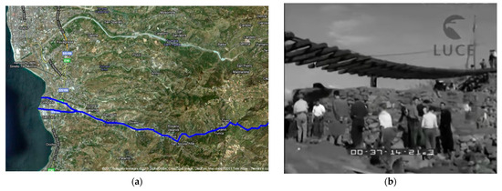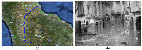 (a) The course of the Crati River; (b) an image of the 1959 flood.