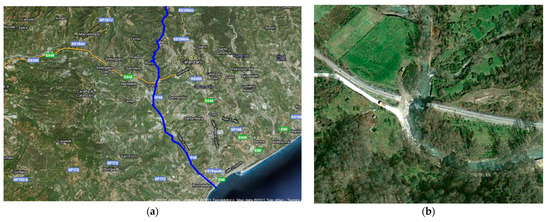 The Corace River basin has a surface area of 294.50 km2. With a length of 48 km and an average annual flow rate of approximately 4.4 m3/s, the river flows into the Ionian Sea after a course of 48 km (Figure 3a). As for the hydrographic network, it shows a hierarchical structure with seven Horton stream orders and consists of 4033 channel segments, of which about 100 have lengths exceeding 1 km [28]. This river also has a markedly torrential regime, and several floods happened in the last decades (Figure 3b). In the section between 9 and 10 km from the river mouth, numerous road crossings are present, featuring structures built within the riverbed. As regards flood prevention measures, in recent years, the improvement of the embankments in the stretch of the river mouth has been carried out.