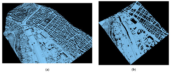The possibility of discriminating the first and the last pulse was exploited. This opportunity allowed obtaining both the DSM and the DTM of the surveyed areas (Figure 6). The DTM is used for hydraulic calculations in the riverbed area, but the DSM plays a fundamental role, especially in urbanized areas, to be able to predict the effects of a flood. The difference between DSM and DTM, i.e., the difference between the first and the last pulse, can provide, in the riverbed areas, the average height of the vegetation and its density, which allow an accurate evaluation of the roughness.