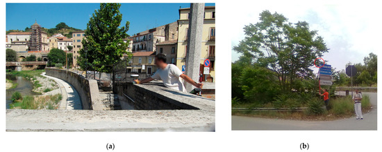(a) GCP on a riverbank parapet of Crati River; (b) GCP on a road sign near Corace River.