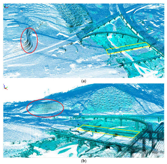 Figure 9 shows the extrados of a bridge, which was used for the registration. The model derived from the points collected with TLS was used as the ground truth; the distances between the ALS points and the reference surface allow for an assessment of the vertical accuracy of the registration. In this case, the vertical accuracy is ±15 cm. A similar verification was carried out for the horizontal accuracy, using near-vertical surfaces (such as building walls or retaining walls, like those circled in red in Figure 10). The resulting horizontal accuracy is ±16 cm.