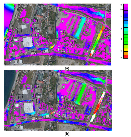 The procedure described above enabled a more realistic representation, in which features such as building walls, retaining structures, and artificial embankments are clearly highlighted. The benefits of this refined visualization go beyond aesthetics: the increased level of detail improves the identification of man-made elements within potentially flooded areas. In some cases, the enhanced resolution also makes it possible to reassess results initially derived using coarser calculation cells, potentially leading to significantly different values and highlighting the need for more refined hydraulic calculation. This is clearly illustrated in Figure 16b, where not only are the artifacts more distinctly highlighted, but significant variations in the thematic values are also evident. In particular, on the right side of the figure, the deposition values are noticeably higher in the trench area of the E90 road, located between the two final branches of the fiumara.