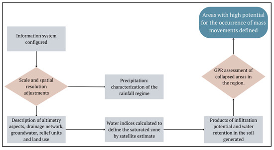 The adopted sequence starts with the diagnosis of the area through the configuration of the base cartography, the characterization of the area affected by mass movements using ground-penetrating radar (GPR), and the identification of the most critical areas associated with soil water saturation. Figure 2 summarizes the main steps, highlighting the following methodological elements: