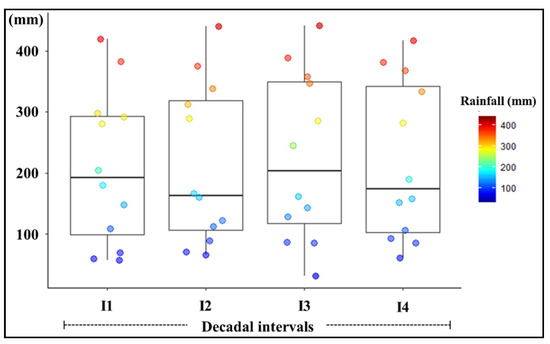 Decadal distribution of precipitation (monthly average): 1980–1989 (I1), 1990–1999 (I2), 2000–2009 (I3), and 2010–2019 (I4).