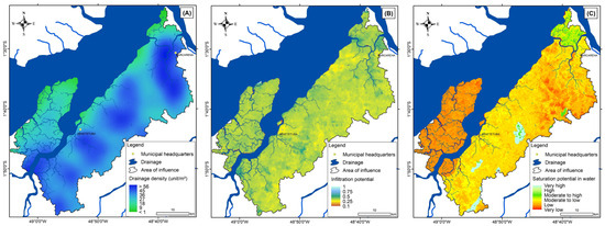 (A) Drainage density, (B) infiltration potential (up to 200 cm), and (C) saturation potential in water: the behavior of water in the soil profile.