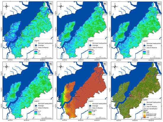 (A) Normalized difference water index (NDWI), (B) modification of normalized difference water index (MNDWI), (C) water ratio index (WRI), (D) automated water extraction index (AWEI), (E) water mass equivalent (GRACE), and (F) degree of land use intensification: land use and presence of wetlands. Correlation sample: NDWI × MNDWI, Pearson = 0.170; NDWI × WRI, Pearson = 0.209; NDWI × AWEI, Pearson = 0.222; MNDWI × WRI, Pearson = 0.287; MNDWI × AWEI, Pearson = 0.936; WRI × AWEI, Pearson = 0.195.