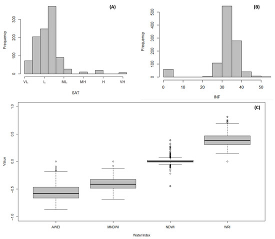 (A) Saturation potential in water (SAT). (B) Infiltration potential (INF) histogram distribution. (C) Normalized difference water index (NDWI), modified normalized difference water index (MNDWI), automated water extraction index (AWEI), and water ratio index (WRI): boxplot distribution.